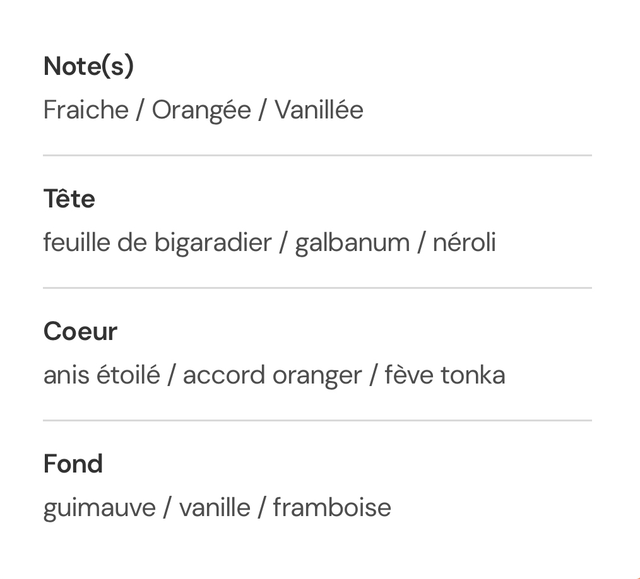 Une fragrance douce et apaisante, où la fraîcheur de l’oranger et du néroli rencontre la chaleur vanillée de la fève tonka et de la guimauve. Un cocon de douceur, comme une sieste au cœur de l’hiver.