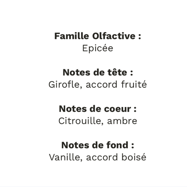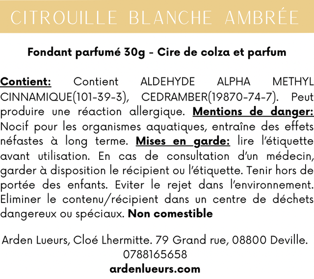 Succombez au charme raffiné de notre fondant parfumé Citrouille Blanche Ambrée. Il marie la rondeur gourmande de la citrouille blanche à la chaleur de l’ambre et à des notes épicées subtiles. Une fragrance élégante et enveloppante qui évoque les soirées d’automne raffinées et les ambiances cocooning pleines de douceur.