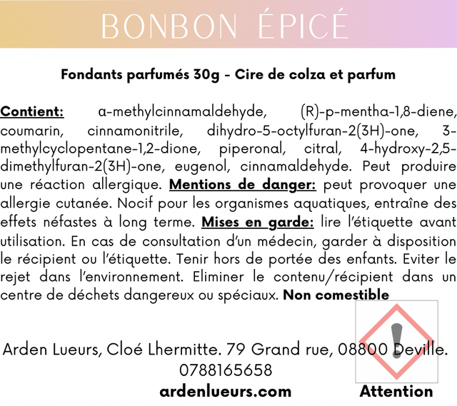 Succombez au charme unique de nos fondants parfumés Bonbon Épicé. Alliant la douceur sucrée d’un bonbon à la chaleur des épices, il diffuse une fragrance à la fois gourmande, réconfortante et légèrement piquante.